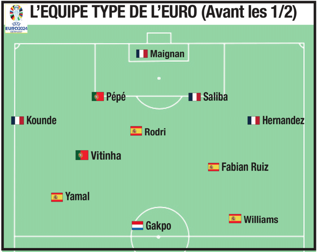 Quatre Français et quatre Espagnols font partie de l’équipe type de l’Euro, avant les demi-finales programmées mardi (France – Espagne) et mercredi (Angleterre – Pays-Bas). Mike Maignan, William Saliba, Théo Hernandez et Jules Kounde, principaux artisans de la défense imperméable des Bleus sont bien présents. Nous avons enlevé Dayot Upamecano, qui aurait tout aussi mérité, pour faire une place au vétéran portugais, Pépé (41 ans).