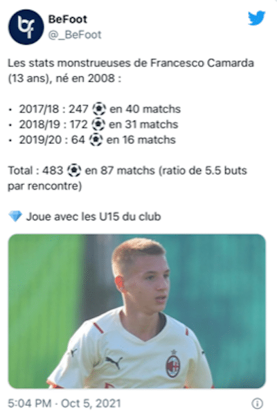 Francesco Camarda est Italien, il n’a que 13 ans, et affole déjà tous les agents d’Europe ! Il faut dire que celui qui est déjà « surclassé » chez les U15, vint d’inscrire 483 buts au cours de ses trois dernières saisons ! le tout en 87 matchs, ce qui donne un ratio de 5,5 buts par match !
