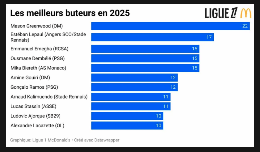 À lireLigue 1 : l’OM, un statut remis en questionA noter, la présence d’Esteban Lepaul (Angers et Rennes) à la 2ème place du classement des meilleurs buteurs en 2025, avec 17 buts (contre 15 pour le trio Dembélé, Emegha et Biereth).