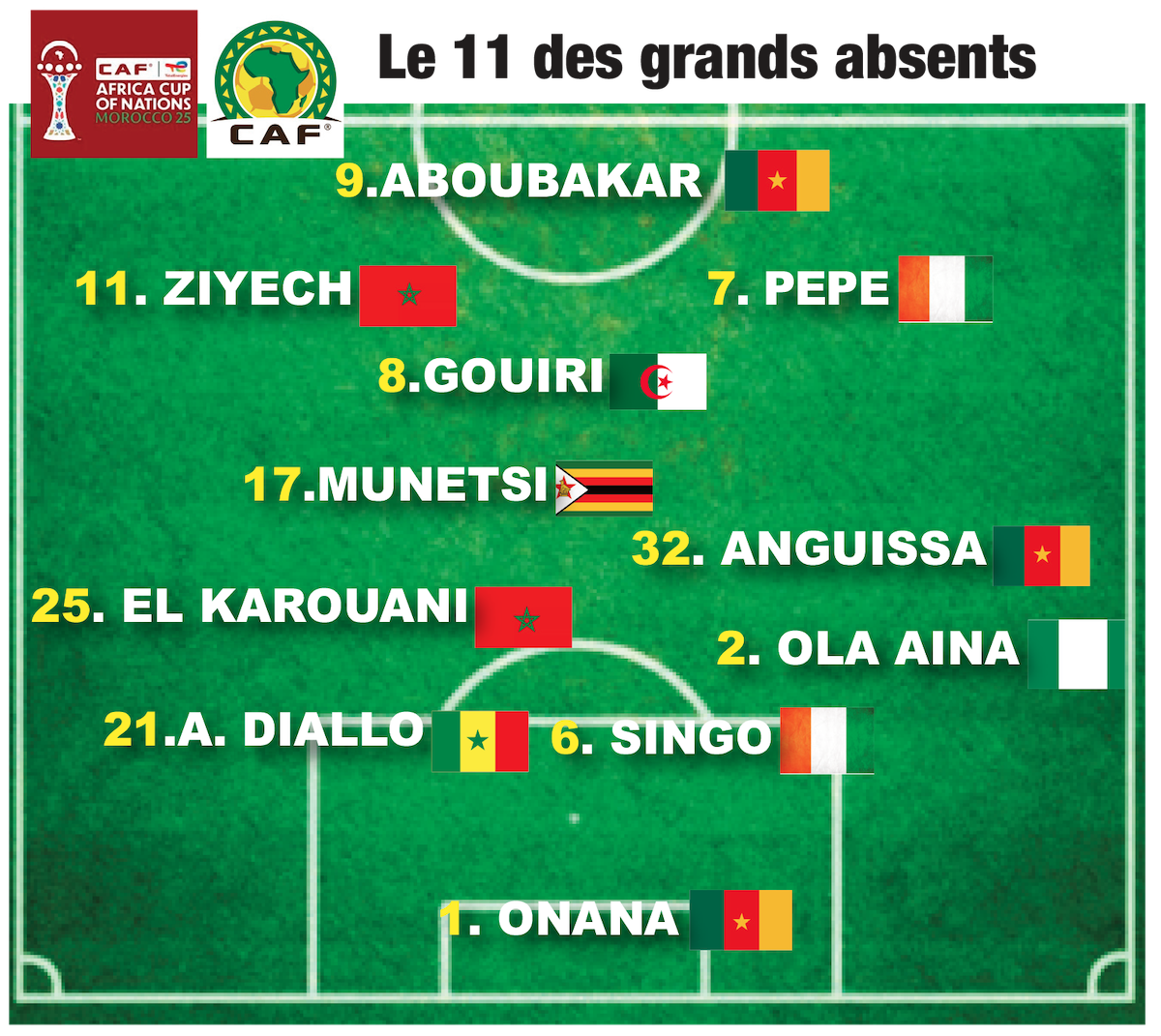 Alors que toutes les listes des sélections appelées à disputer la CAN (21 décembre 2025 – 18 janvier 2026) ont été dévoilées, 100% Foot a dressé l’équipe type des grands absents. On a beaucoup parlé des absences des Camerounais Aboubakar et Onana, non retenus, ou encore de l’Ivoirien Pelé, écarté à la surprise générale, mais d’autres absences notables sont à signaler. A l’image de Ziyech (Maroc), qui n’a pas réussi à revenir à temps physiquement, ou l’international algérien de l’OM, Gouiri, que l’on ne reverra sur un terrain pas en 2015.