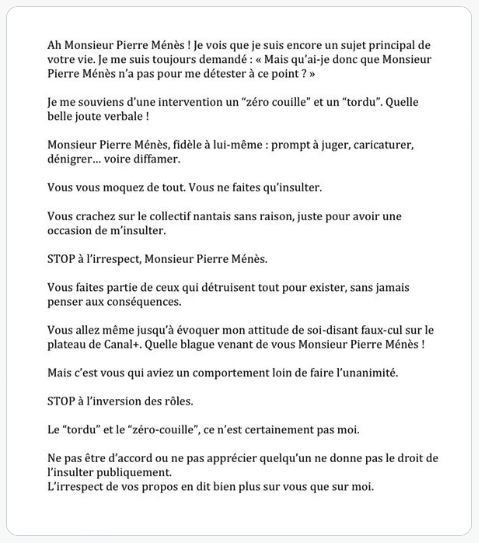 Pour rappel, la dernière sortie de Pierre Ménès sur Mickael Landreau est très récente. Après l’annonce de la fin du collectif nantais (créé dans le but de racheter le FC Nantes), le polémiste s’en est pris violemment à l’ancien joueur. « A-t-il seulement cru un jour que ça allait fonctionner ? (…) Je ne crache pas sur ceux qui osent, je crache uniquement sur Landreau. Parce qu’il le mérite ». Menès était aussi revenu sur l’époque où ils étaient tous les deux sur Canal+. « Je l’ai pratiqué comme joueur puis au CFC. Chaque émission avec lui était une souffrance . Parce qu’il disait régulièrement le contraire en plateau de ce qu’il disait en coulisse. Et je ne supporte pas ça ». Avant un dernier tacle sur sa présence à la tête du collectif nantais :« C’est une planche pourrie ».