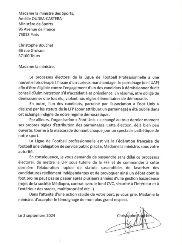 Dans un courrier adressé à la ministre des Sports démissionnaire, Amélie Ouda-Castera, Christophe Bouchet demande « de suspendre sans délai ce processus électoral, de mettre la LFP sous tutelle de la FFF ».