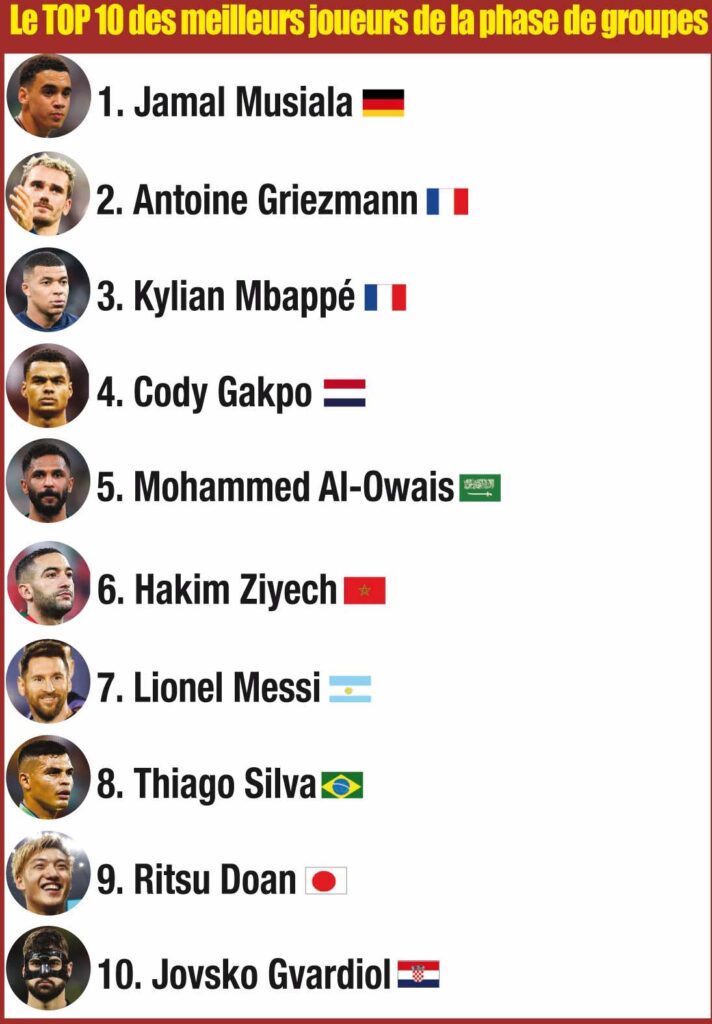 48 matchs joués, des exploits, des ratés… C’est le Top 10 des joueurs qui ont marqué la phase de groupes qui s’est terminée vendredi soir. Avec le jeune Allemand Jamal Musiala en tête devant deux Français : Antoine Griezmann et Kylian Mbappé.