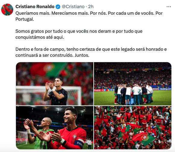 « Nous en voulions plus. Nous en méritions plus. Pour nous. Pour chacun de vous. Pour le Portugal. Nous sommes reconnaissants pour tout ce que vous nous avez donné et pour tout ce que nous avons accompli jusqu’ici. Sur et en dehors du terrain, je suis sûr que cet héritage sera honoré et continuera à être construit. Ensemble », écrit Ronaldo.