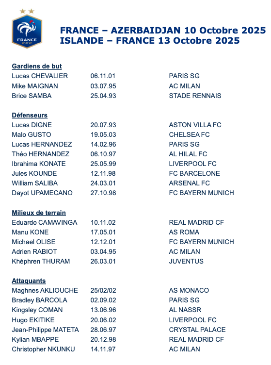 Alors que l’on pouvait s’attendre à voir Bradley Barcola, qui revient de blessure, être laissé au repos, l’avance d’absents en attaque (Dembélé, Doué, Kolo Munani, Cherki et Thuram) a empêché le sélectionneur de se priver du Parisien. D’ailleurs, plusieurs joueurs sont incertains, à l’image d’Hugo Ekitiké (sorti blessé mardi avec Liverpool à Galatasaray) ou Kephren Thuram (absent avec la Juventus mercredi contre Villarreal). Sans parler d’Eduardo Camavinga, qui vient tout juste de reprendre la compétition après plus d’un mois sans jouer. Des incertitudes qui auraient pus favoriser les retours de Florian Thauvin (Lens) et Corentin Tolisso (Lyon). Selon les matchs du week-end, cette liste des 23 pourrait d’ailleurs évoluer, avant lundi et le rendez-vous à Clairefontaine.