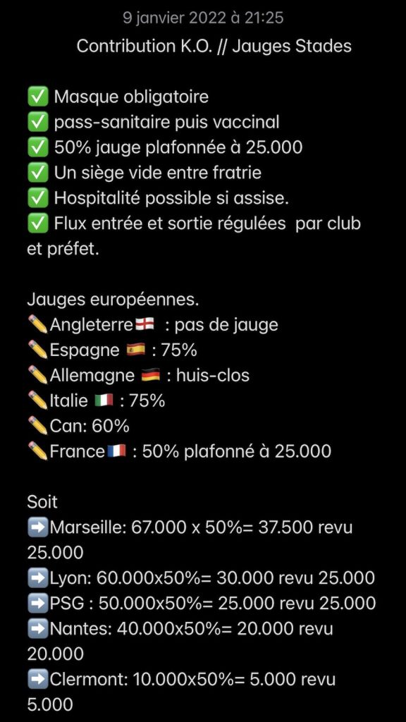 Homme de terrain, passionné de foot (il a notamment été président du club de Poissy), Karl Olive a résumé sa proposition, en une infographie, publiée sur les réseaux sociaux : un siège sur deux laissé vacant, des jauges revues à 50% de la capacité des stades, mais plafonnées à 25.OOO et la réouverture sans limite des espaces appelés « d’hospitalité » (loges, service de restauration…), en sont les principales mesures.
