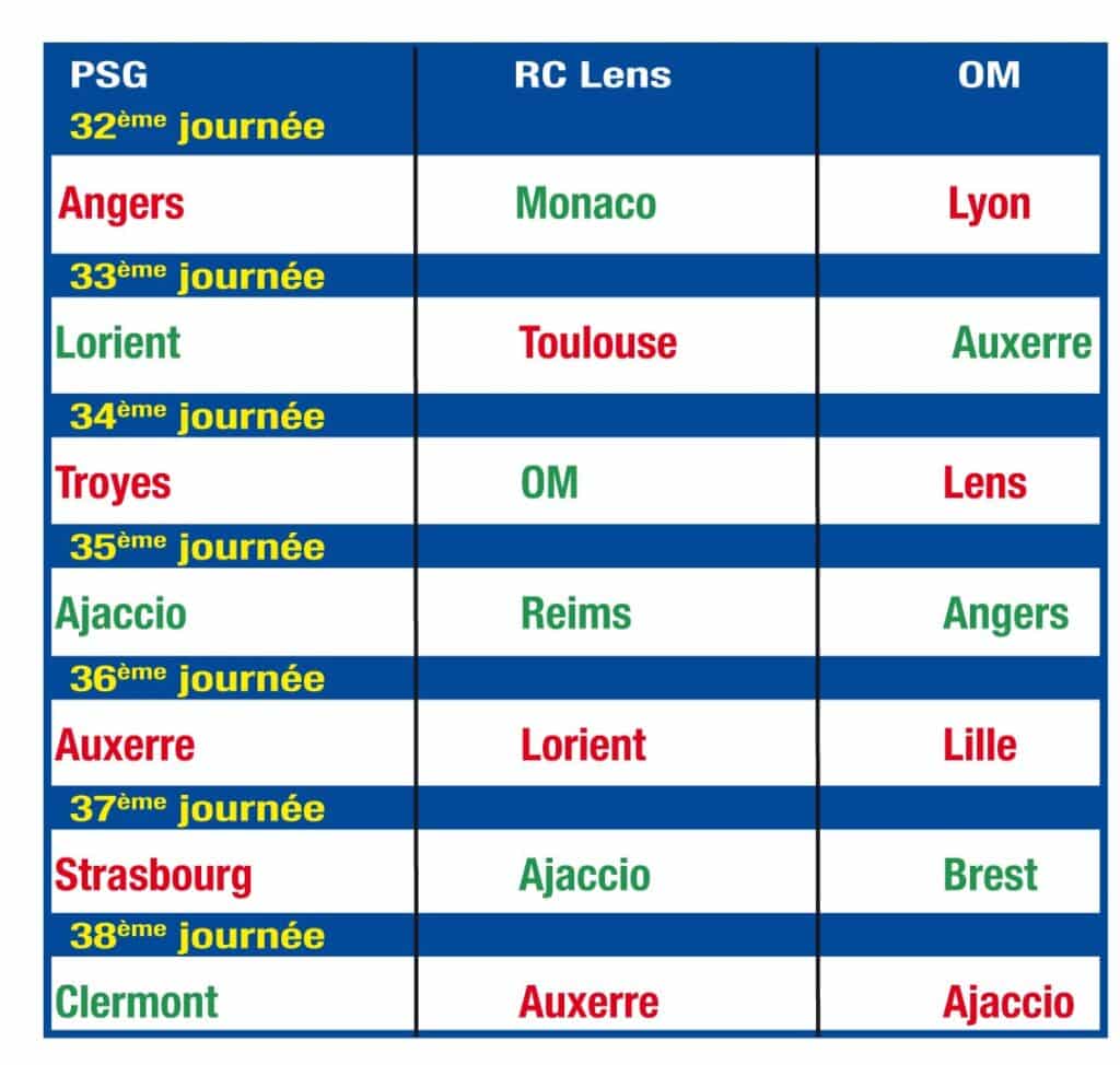 Pour permettre à chacun de se faire une idée, en fonction du nombre de points qui sépareront encore les deux équipes à la fin du match, mais aussi après celui de l’OM contre Troyes au Vélodrome (dimanche, 20h45), nous avons dressé la liste des adversaires des trois équipes (Paris, Lens et Marseille) pour les 7 journées qui resteront à jouer.