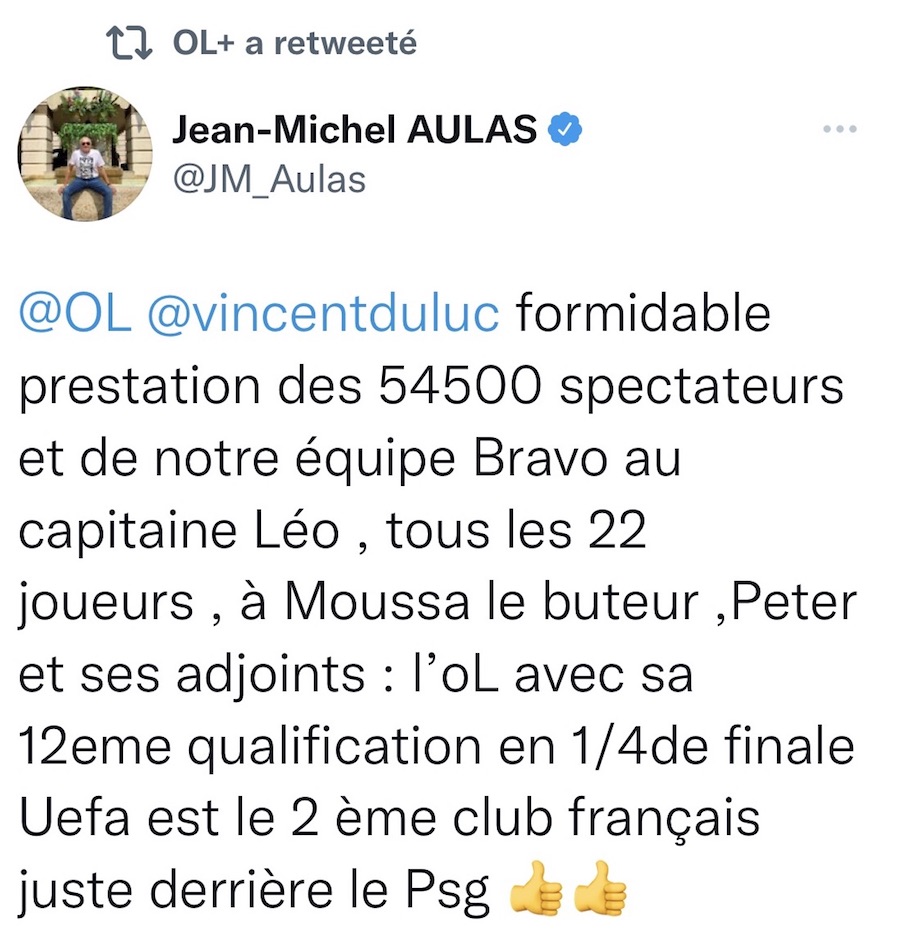 À lireVersailles, Saint-Maur, Drancy, le Racing… les tendances pour le football francilien en 2026« Formidable prestation des 54500 spectateurs de notre équipe Bravo au capitaine Léo (ndlr : Dubois), tous les 22 joueurs, à Moussa le buteur, Peter et ses adjoints : l’OL avec sa 12eme qualification en 1/4de finale Uefa est le 2ème club français juste derrière le PSG » a réagi Jean-Michel Aulas dans un tweet.