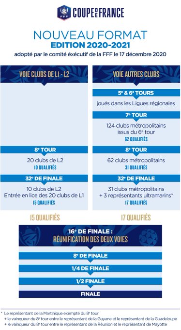 La formule : d’un côté 17 équipes issues du monde amateur (après plusieurs tours à élimination directe), de l’autre 15 équipes professionnelles issues des matchs à élimination directe qui opposeront entre elles 10 équipes de L2 (issues d’un tour préliminaire) et les 20 clubs de Ligue 1. Les 32 équipes restantes disputeront les 16èmes de finale.