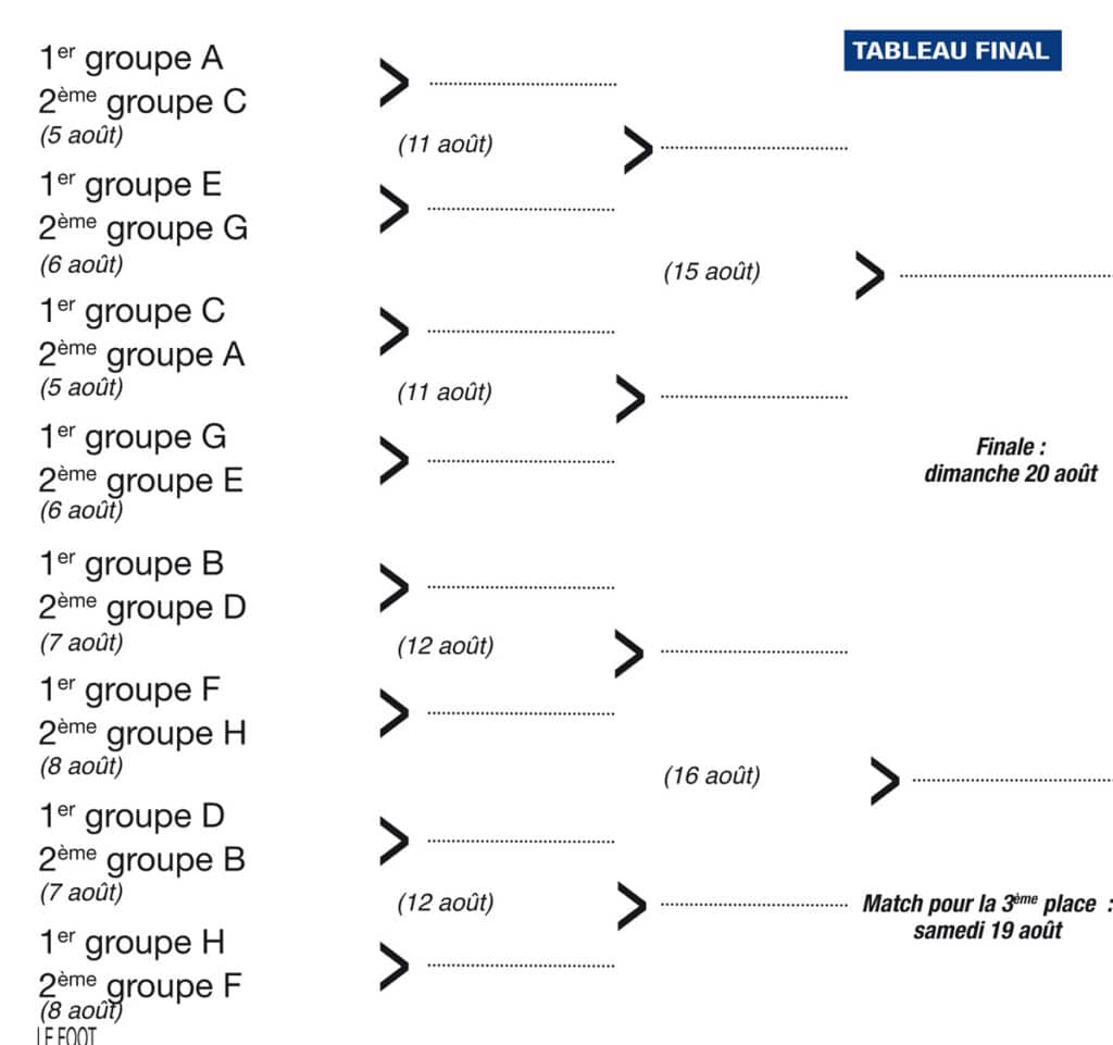 Alors que 32 équipes participent à la compétitions, seules les premières et deuxièmes de leur groupe sont qualifiées pour les huitièmes de finale.
