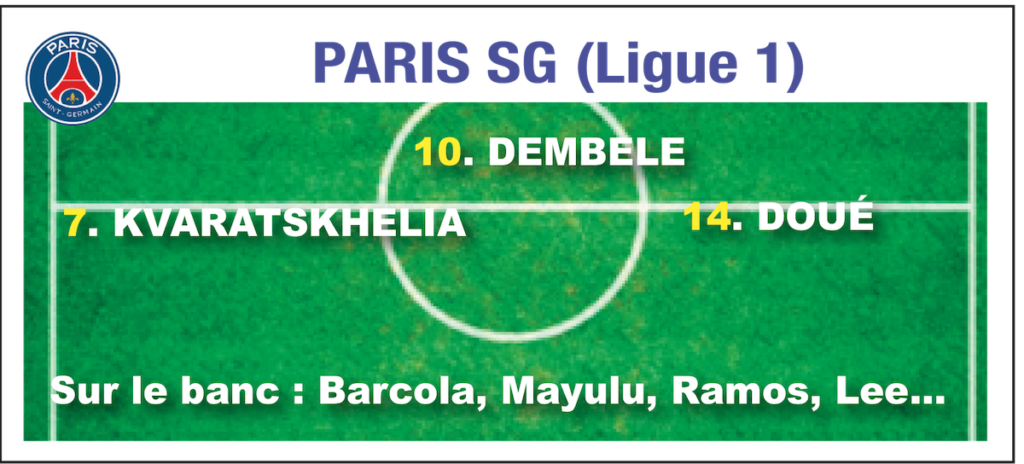 Kvaraskhelia – Dembélé – Doué, avec Barcola en renfort : l’attaque titulaire du PSG reste une valeur sûre et encore en pleine progression. Ousmane Dembélé sera sans doute Ballon d’Or et Désiré Doué Golden Boy. Une attaque toujours pleine de promesses, qui peut faire très mal à toutes les équipes.