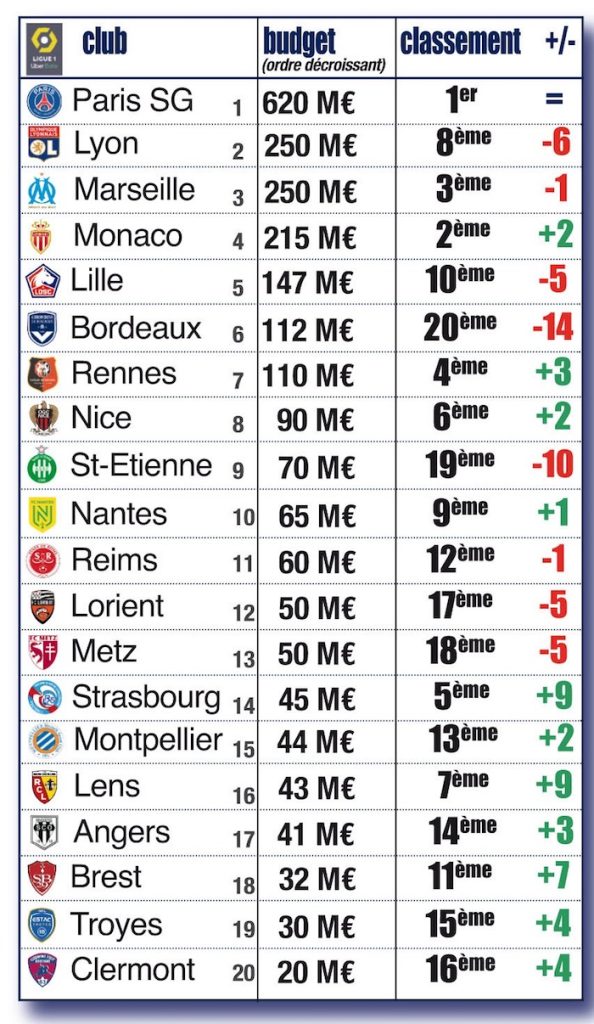 Si le PSG, au budget stratosphérique (deux fois et demi celui de des principaux concurrents, plus de trente fois supérieur à celui de Clermont) est logiquement en tête et que l’on peut considérer que l’OM (2ème budget et actuellement 3ème), comme Monaco (3ème budget et 2ème) sont au rendez-vous attendu, c’est loin d’être le cas pour tous les clubs.