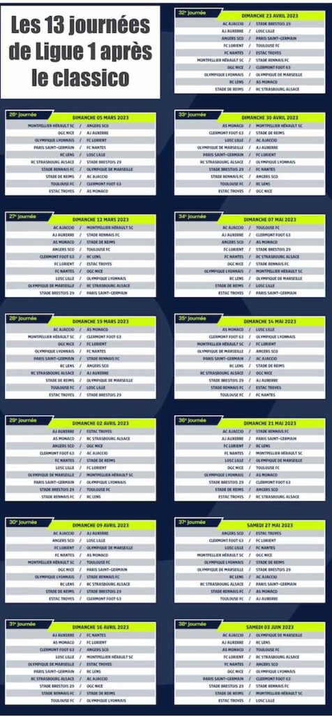 À lireSamuel Moutoussamy (RD Congo), le joueur qui fait briller l’ombre…En mars, le PSG recevra Nantes, ira à Brest, avant de recevoir Rennes et Lyon. Pendant ce temps-là, l’OM ira à Rennes et Reims. D’ici la fin de saison, l’OM ira aussi à Lyon, à Lens et à Lille.