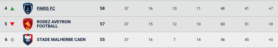 Saint-Etienne et Angers sont certains de se partager les 2ème et 3ème place. En revanche, derrière, ils sont 3 pour 2 places. Le Paris FC (4ème avec 58 points) est le mieux placé pour terminer dans les 5. Même en cas de défaite à Bastia les Parisiens peuvent se qualifier pour les barrages. Mais attention aux écarts de buts. Caen, à 3 points avec une différence de +3, peut vite revenir si le PFC (+7) perd par deux buts d’écart en Corse. Le mieux pour les hommes de Stéphane Gili est de faire au moins un nul. Rodez, 5ème avec 57 points et une belle différence de buts (+9) peut se contenter d’un nul contre Ajaccio. Il faudrait que les Normands battent Valenciennes par minimum 7 buts d’écart pour passer devant les Aveyronnais. Ce nul peut aussi suffire à Rodez, pour passer 4ème, si le PFC s’incline à Bastia. En sachant qu’Ajaccio est la deuxième pire équipe de Ligue 2 en déplacement (derrière Valenciennes), avec seulement 10 points pris en 18 matchs.