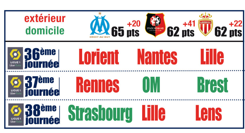 A trois journées de la fin, trois équipes se battent pour les deux places sur le podium derrière le PSG : l’OM (65 points et +20 de différence de buts), Rennes (62 pts, +41) et Monaco (62 pts, +22).