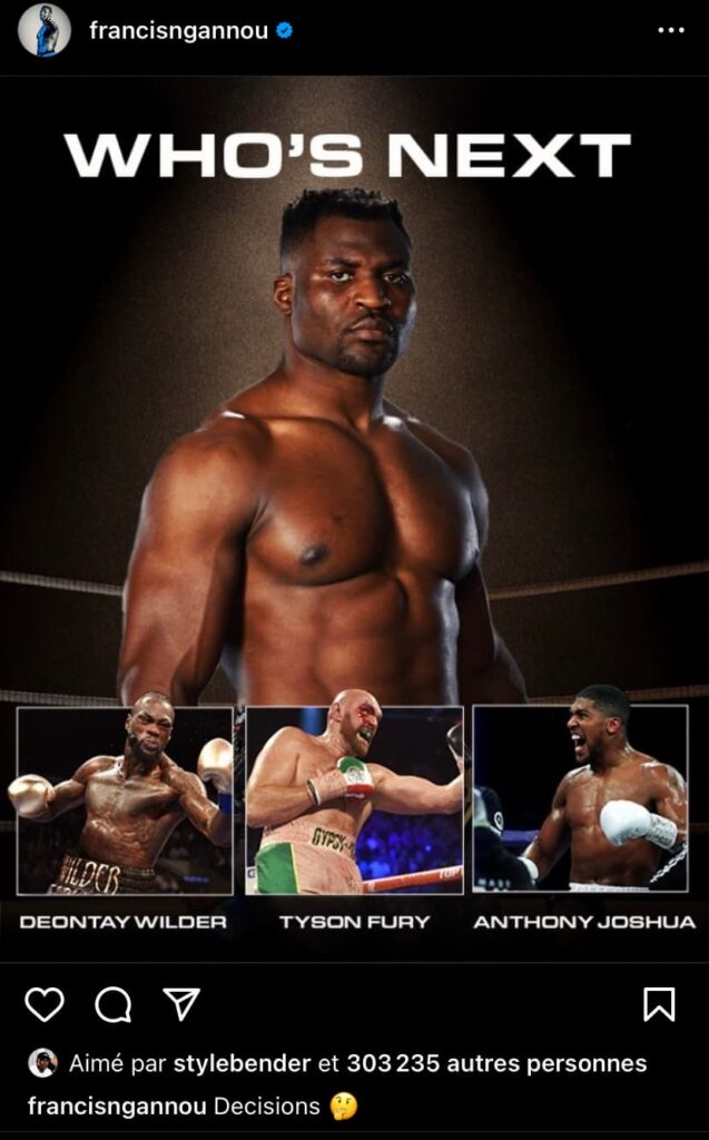 À lireUFC : Aspinall – Gane, programmé dès le mois de janvier ?Quoi qu’il en soit, Francis Ngannou n’a plus le temps d’attendre. Depuis son départ de l’UFC, chaque mois passé loin de la cage ou du ring, à attendre un hypothétique combat contre Fury ou Wilder, amenuise sa cote et, du même coup, sa valeur marchande. A bientôt 37 ans, le temps presse…