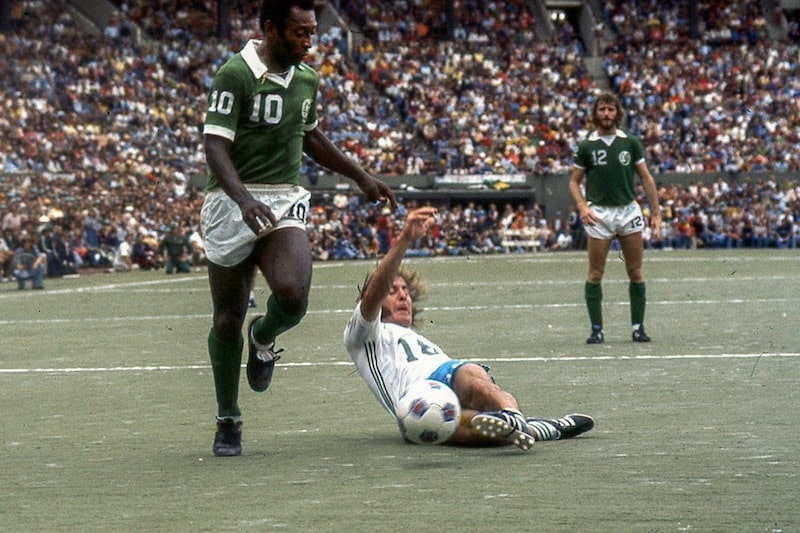 En 1975, cin ans après avoir inscrit le millième but de sa carrière dans un stade Maracana en fusion (le match a été interrompu pendant 20 minutes), Pelé, qui a pris sa retraite international six ans plus tôt, quitte Santos pour rejoindre le Cosmos New York, dont il contribuera grandement à la notoriété.