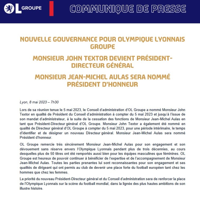 Il en sera question un peu plus tard quand le communiqué sur la nouvelle gouvernance de l’OL tombe dans la nuit.