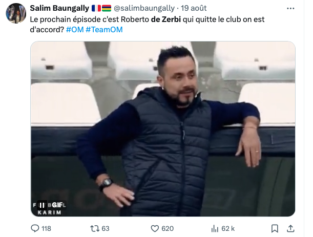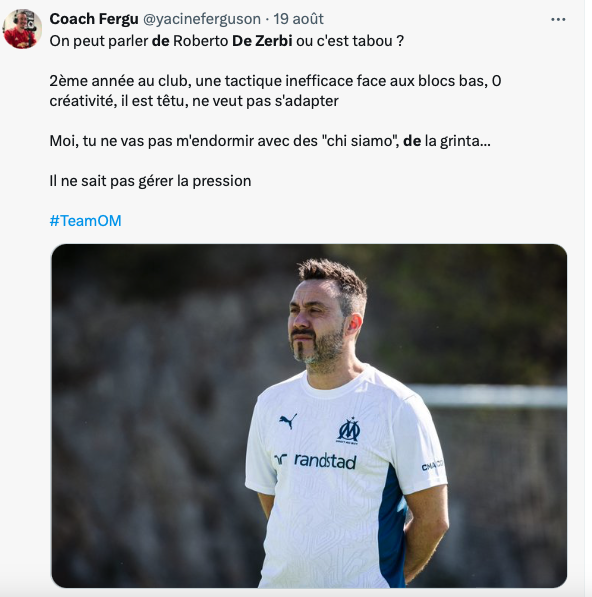 « C’est De Zerbi qui a crée ce climat de tension. Il prend en otage tout le monde. C’est lui qui doit partir » a notamment clamé Adel, supporter de l’OM, sur RMC, lors de l’émission After Foot. « Il ne sait pas gérer la pression », écrit cet insider qui reproche à l’Italien de ne pas faire évoluer l’équipe. « Le prochain épisode, c’est le départ de De Zerbi ? » S’interroge ironique cet autre…
