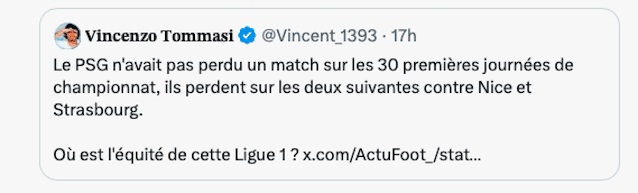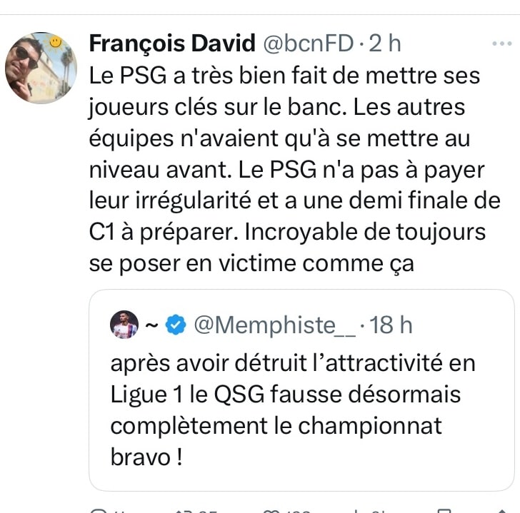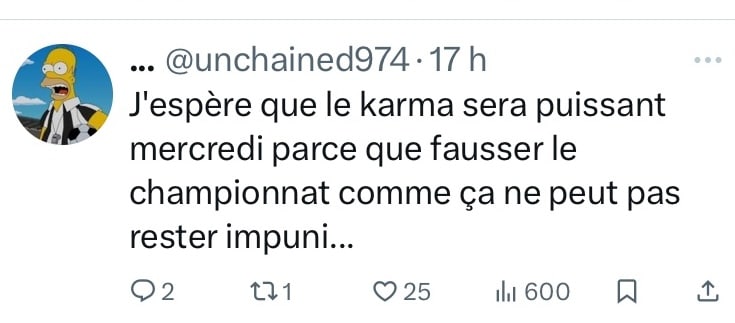 « J’espère que le karma sera puissant mercredi parce que fausser le championnat comme ça ne peut pas respecter impuni » écrit ce supporter de l’OM, très désabusé sur X. Ce compte de supporters de l’OL dénonce l’attitude des Parisiens (voir-ci dessus), et se fait reprendre de volée par ce supporter du PSG qui revient sur la défaite des Lyonnais dans le derby (ci-dessous)…