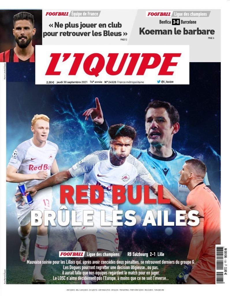 La deuxième Une du quotidien est consacrée à la défaite du LOSC hier face au Red Bull Salzbourg. Un rapport avec les vertus de la boisson énergétique ?
