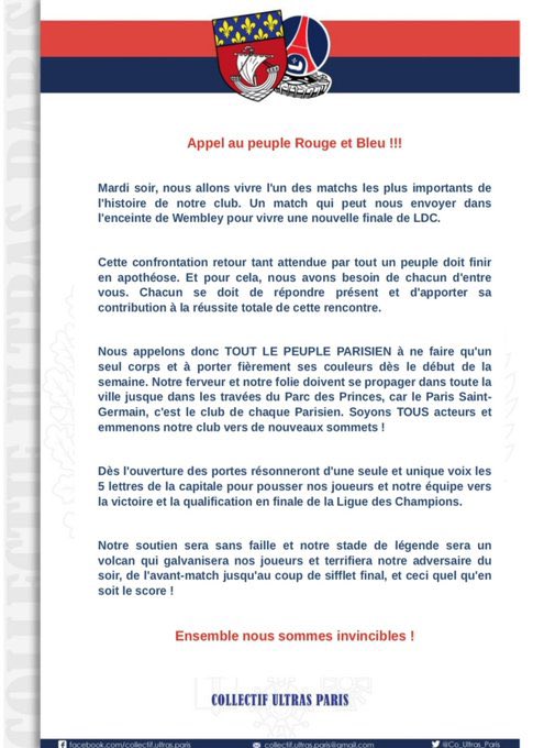 Parallèlement, le collectif ultra Paris à lancé un “Appel au peuple rouge et bleu”. « Soyons tous acteurs et emmenons notre club vers de nouveaux sommets », peut-on lire dans le communiqué diffusé sur les réseaux sociaux. « Notre soutien sera sans faille et notre stade de légende sera un volcan qui galvanisera nos joueurs et terrifiera notre adversaire du soir, de l’avant-match jusqu’au coup de sifflet final, et ceci quel qu’en soit le score ! ». Les supporters du PSG sont notamment appelés à porter les couleurs du club « dès le début de la semaine ».