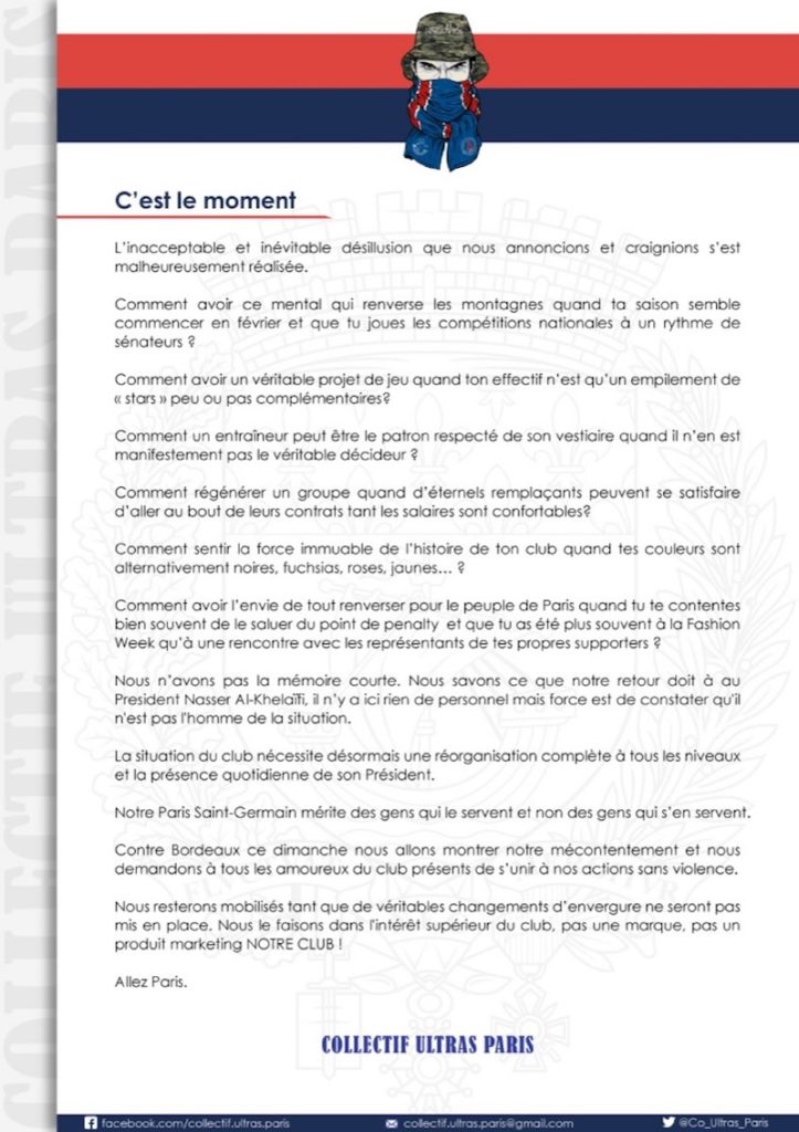 Dans un communiqué titré « c’est le moment », le collectif Ultras Paris annonce qu’il va « montrer son mécontentement » à cette occasion, et demande du changement, estimant notamment que Nasser Al-Khelaïfi « n’est pas l’homme de la situation ».