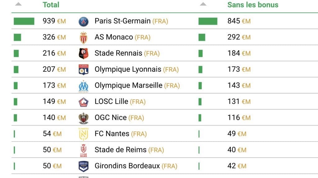 La suite du classement est assez surprenante, puisque l’on trouve deux équipes en grande difficulté sportivement la saison dernière : Nantes (54 millions, 8ème) et Bordeaux (50 millions, 10ème).