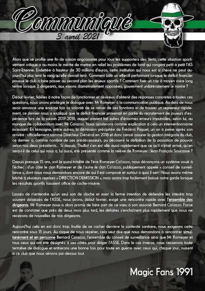 Le groupe des Magic Fans a notamment publié un communiqué pour dénoncer la direction bicéphale du club. « Comment fixer un cap à moyen voire long terme lorsque 2 dirigeants, aux visions diamétralement opposées, gouvernent unilatéralement le navire ? », peut-on lire dans le texte qui réclame (pour la énième fois) un rendez-vous avec les deux présidents et les membres du conseil de surveillance. « Nous exigeons cette rencontre sous 15 jours. Dans le cas contraire nous cesserons toute tentative de dialogue et entrerons une bonne fois pour toute en guerre avec ceux qui, chaque jour, nuisent à ce club que nous aimons par dessus tout ».
