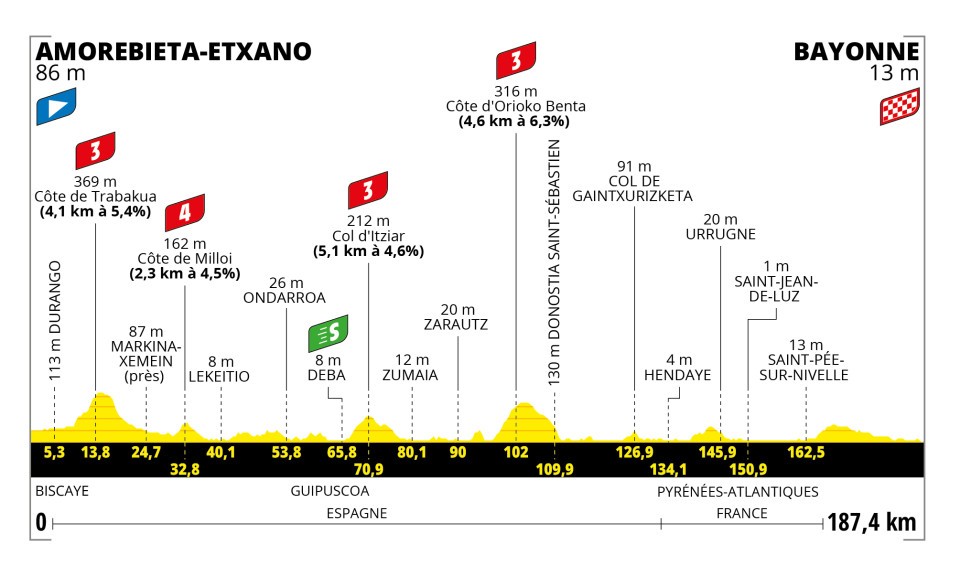 L’étape de 187,4 km s’étire le long de l’océan avec quatre côtes espagnoles au programme (Trabakua, Milloi, Itziar et Benta) avant d’entrer en France par Irun et rejoindre Bayonne, non par la route de la corniche via Saint Jean de Luz comme c’était prévu pour des raisons de sécurité, mais par l’intérieur des terres, pour la 33ème fois dans l’histoire du Tour (dont 10 arrivées), la première depuis 2003, la première sans Bordeaux ou Pau comme départ ou arrivée. Face au stade Jean Dauger cher à l’Aviron Bayonnais, le vainqueur succédera à Tyler Hamilton (2003).