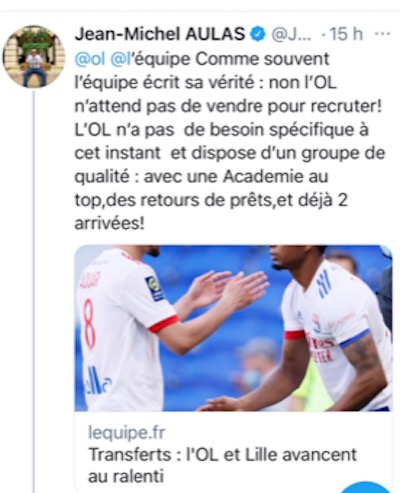 Une analyse qui ne plait pas du tout à Jean-Michel Aulas qui est monté au créneau. « Comme souvent, l’Equipe écrit sa vérité », a réagi sur twitter le président de l’OL à un article de nos confrères. « Non l’OL n’attend pas de vendre pour recruter ! L’OL n’a pas de besoin spécifique à cet instant et dispose d’un groupe de qualité : avec une académie au top, des retours de prêts, et déjà deux arrivées ! ».