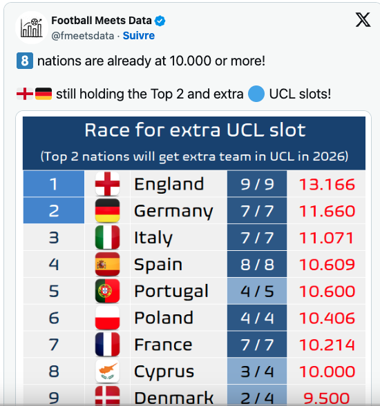 Sur la saison 2025/2026, les deux premières places sont pour l’instant détenues par l’Angleterre et l’Allemagne (9,857), qui devancent la France. Mais l’écart entre l’Allemagne est loin d’être insurmontable, et devrait surtout évoluer lors de la suite de la compétition, avec des bonus accordés pour les participations aux 8èmes, quart et demi-finales dans les trois coupes d’Europe.