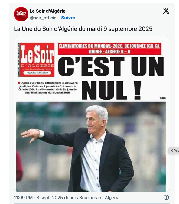 Dans le cas de Petkovic, ce n’est (pas encore) un conflit interne qui mine sa route vers la Coupe du Monde, mais le jeu de son équipe et ses choix. Après le nul contre la Guinée (0-0), la presse algérienne s’est déchainée contre lui. « C’est un nul ! » écrit carrément, en énorme, sur sa Une, le Soir d’Algérie, qui accuse l’équipe d’être « passée à côté » de son match. La Gazette du Fennec est tout aussi dure. Le journal fait un parallèle avec son prédécesseur Djamel Belmadi, en accusant Petkovic « d’inertie tactique », une critique qui avait fini par couter sa place à Djelmadi.