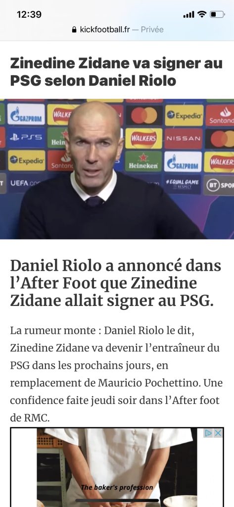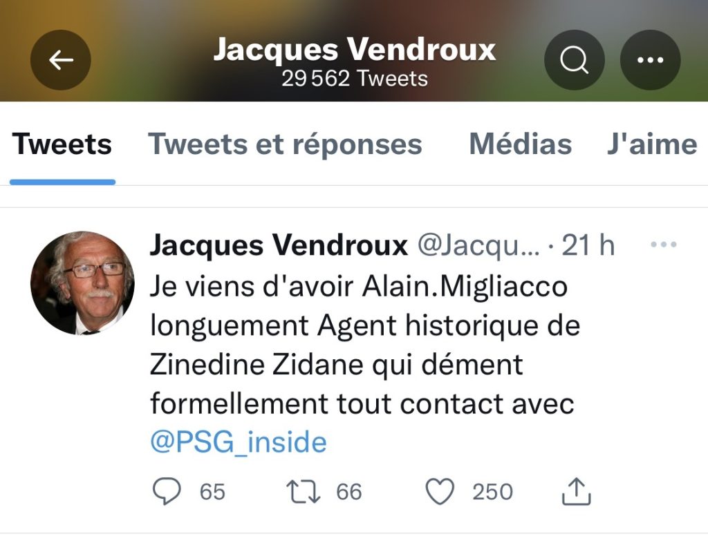 À lireSamuel Moutoussamy (RD Congo), le joueur qui fait briller l’ombre…Depuis quelques jours, tout s’est emballé. De « Zidane est tout proche du PSG » (Geffroy Garetier pour Canal+), « accord de principe entre Zidane et le PSG » (Europe 1), « Zidane sera le prochain entraineur du PSG » (Daniel Riolo pour RMC), on est passé aujourd’hui aux propos, rapportés par Jacques Vendroux, d’Alain Migliaccio, ami et agent historique de Zizou : « Il n’y a aucun contact de près ou de loin entre Zidane et le PSG » ! Pire encore dans l’Equipe (qui a dégainé très vite après le scoop de Jean-François Peres pour Europe 1, annonçant un accord) : « Je ne suis même pas sûr que l’Emir du Qatar soit vraiment intéressé par la venue de Zinedine Zidane », veut nous faire croire Migliaccio.