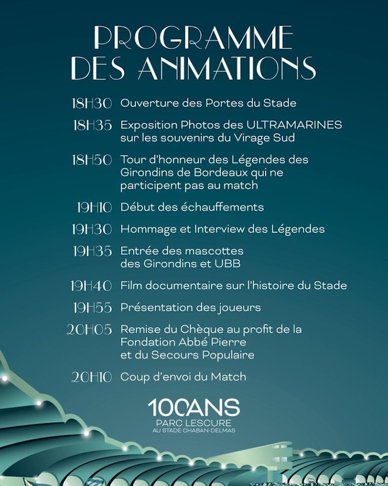 À lireVersailles, Saint-Maur, Drancy, le Racing… les tendances pour le football francilien en 2026Un match organisé par trois entités : les Girondins de Bordeaux, la mairie de Bordeaux et le Variétés Club de France, sous l’égide d’Alain Giresse, né en Gironde, formé aux Girondins et qui a porté les couleurs du club pendant 16 ans. Les bénéfices du match seront reversés au Secours Populaire et à la Fondation Abbé Pierre. Le programme des festivités ci-dessous.